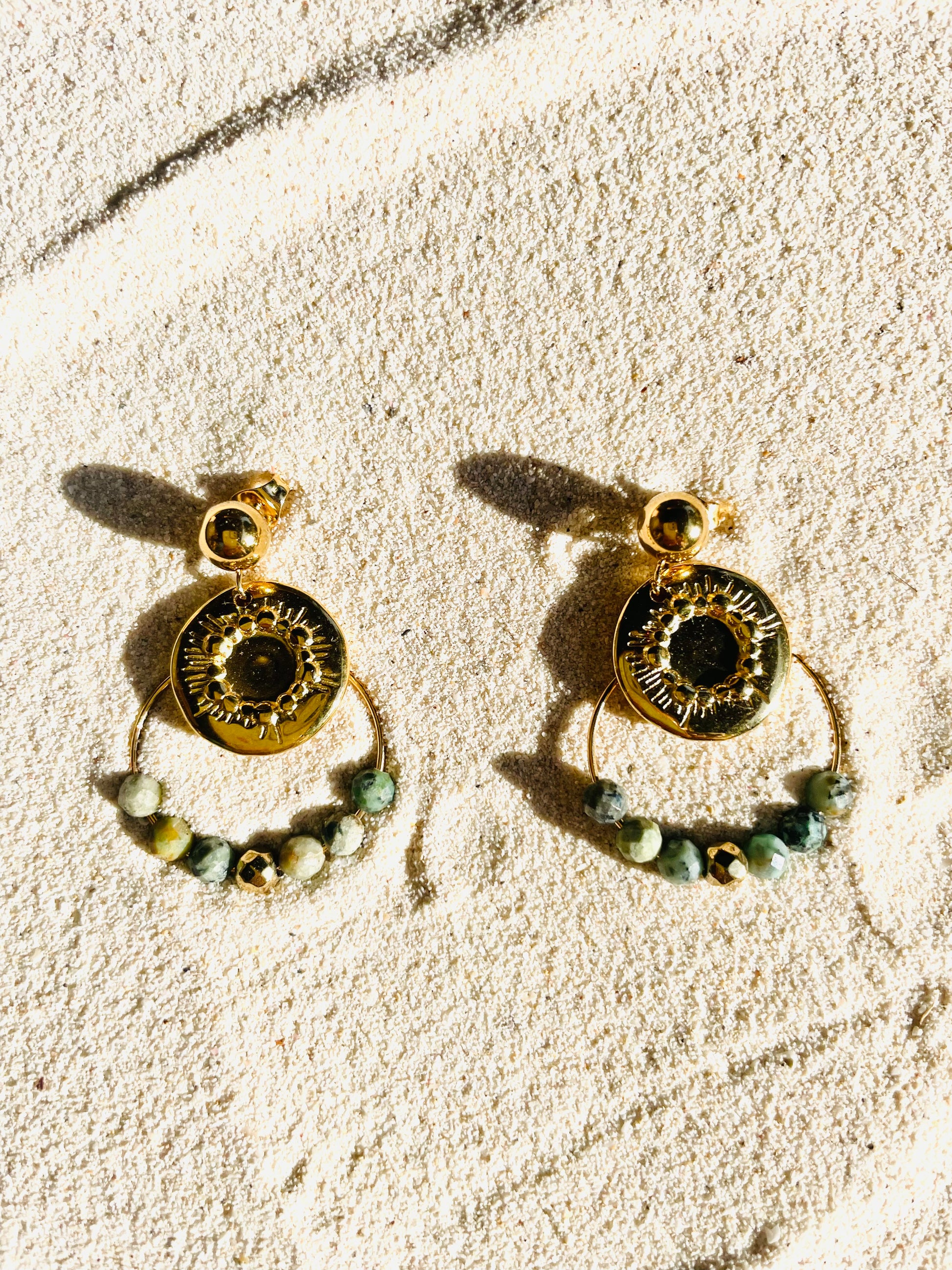 Boucles d’oreilles en acier inoxydable doré et pierres vertes.